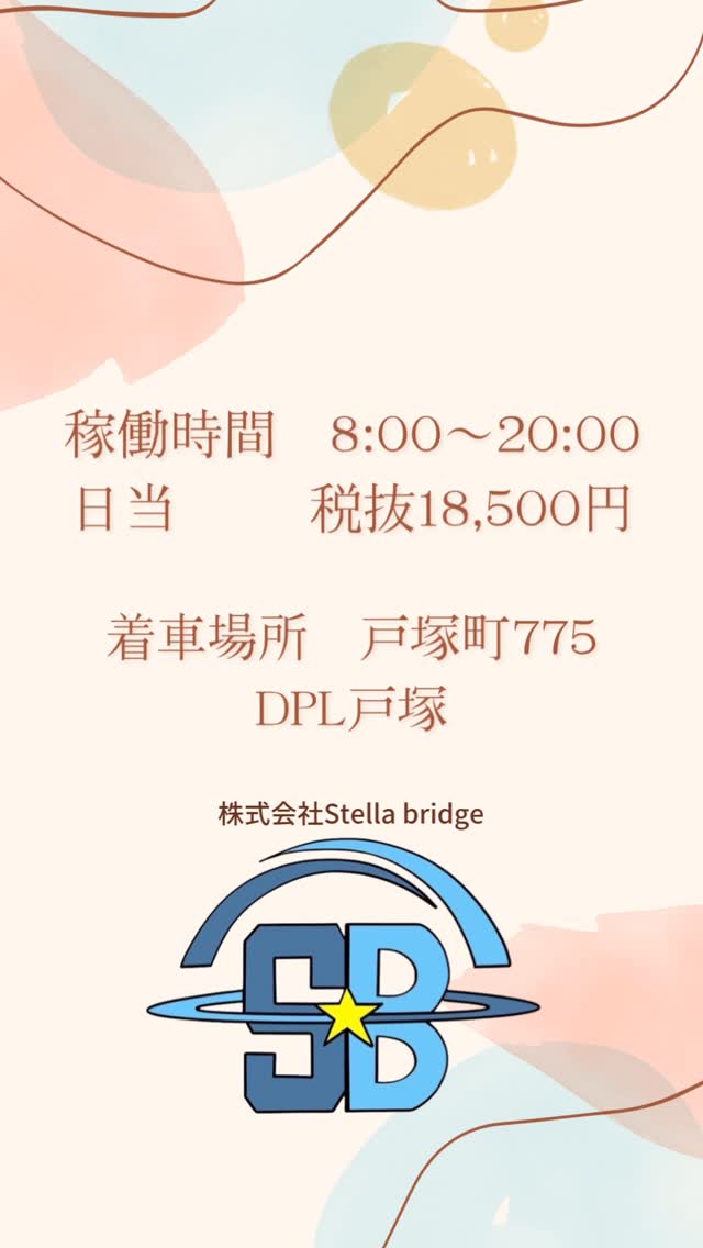 🚨ロイヤリティがひかれることはありません!! 記載金額でのお振り込みです!! 出勤場所 神奈川県横浜市戸塚区戸塚町775 そしてなんと!! 11月21日〜12月11日まで週5回稼働で 66000円のインセンティブが発生!! 神奈川県、東京都、埼玉県、富山県など各所で大募集中です!! ご希望の地域があればお問合わせください☺️ ※地域によりインセンティブ金額、日当に前後あり ⭐️人材紹介制度あり!! 一人ご紹介当たり、年間最大12万円の還元👏 ⭐️労災保険加入制度あり!! 体が資本のお仕事のため、万が一の怪我は不安ですよね。 そんなお悩みも弊社で解決します!! ⭐️キャリアアップ制度有り 各種インセンティブございますのでお問い合わせください!✨ ⭐️車の貸し出し有り 名義変更から保険の加入までお任せください! ⭐️服装髪型自由!! まずは、安心して挑戦!! 先輩と一緒に楽しく仕事を覚えましょう☺️ #軽貨物ドライバー #軽貨物 #軽貨物ドライバー募集 #運送業 #ステラブリッジで働こう #にっこりたじたじ