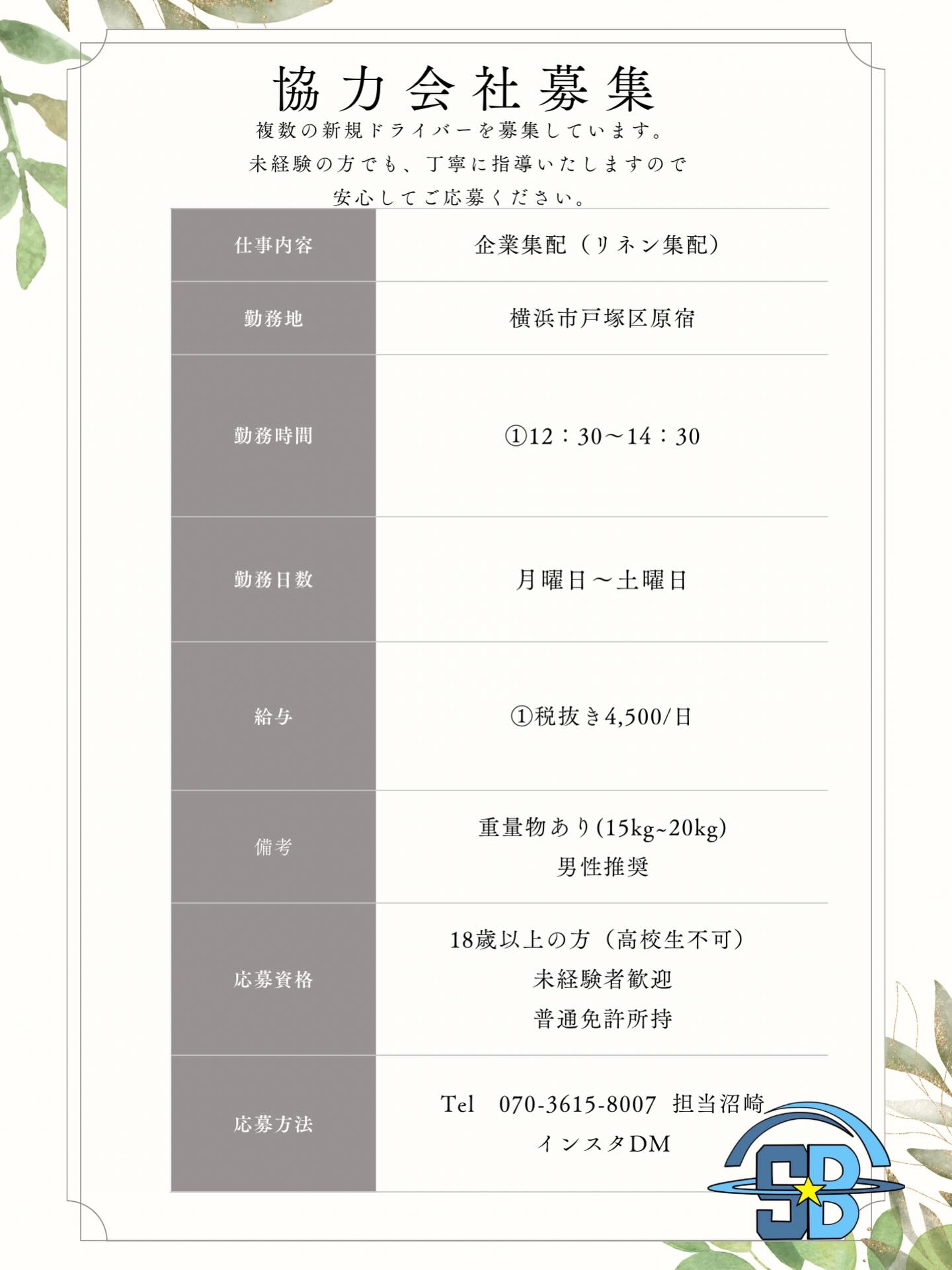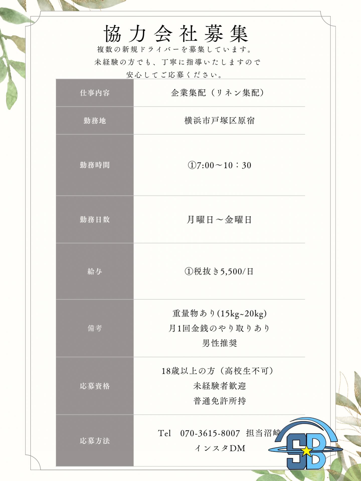 定期案件のご案内です⭐️ 企業様宛への集配 ・配送分類 企業様宛の集配 ・荷姿 リネン袋 ・開始時期 即日 ・稼働曜日・期間 月~土 ・募集人数 1人 ・稼働時間 10:30〜14:30 ・走行距離 30km ・支払い 4,500円税抜 ・着車場所 戸塚区原宿4-50-21 ・配送エリア 旭区 ・配送件数・個数・便数 2件 (曜日によって1件) ・研修 あり ・車両規格 軽バン ・服装・制服 概要に準ずる ・金銭の取り扱い 月1あり ・業務概要 服装規定なし、動きやすい格好 ・担当者  沼崎保樹 TEL07036158007 企業様宛への集配 #軽貨物 #軽貨物ドライバーと繋がりたい #軽貨物ドライバー求人 #軽貨物ドライバー募集中 #軽貨物運送